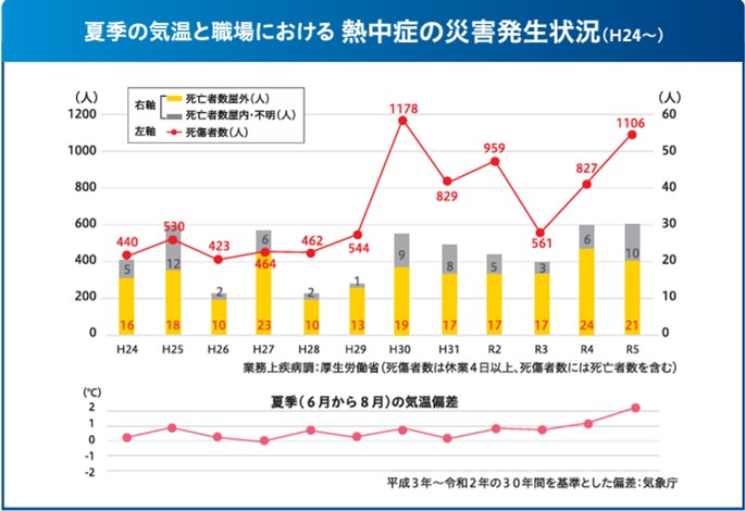 熱中症による死亡災害は、毎年約30件も発生しており、他の労災に比べて6倍の頻度で起きています。
